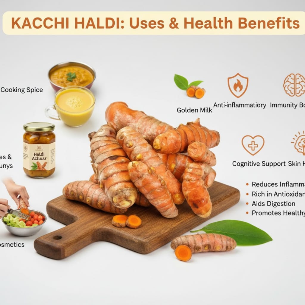 Kacchi Haldi (Fresh Turmeric) is a vibrant root vegetable widely valued in Indian cooking and Ayurveda for its healing properties. Packed with curcumin, antioxidants, and essential nutrients, it helps boost immunity, reduce inflammation, and support skin and liver health. Its earthy aroma and slightly pungent flavor make it ideal for pickles, curries, and herbal drinks like haldi milk. Regular consumption of kacchi haldi aids digestion and enhances overall wellness. However, excessive intake may lead to stomach irritation in sensitive individuals, so moderate use is advised.